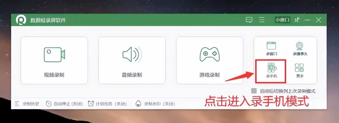 步骤1:在电脑上安装好该软件后进入主界面,找到并点击【录手机】模式进入。