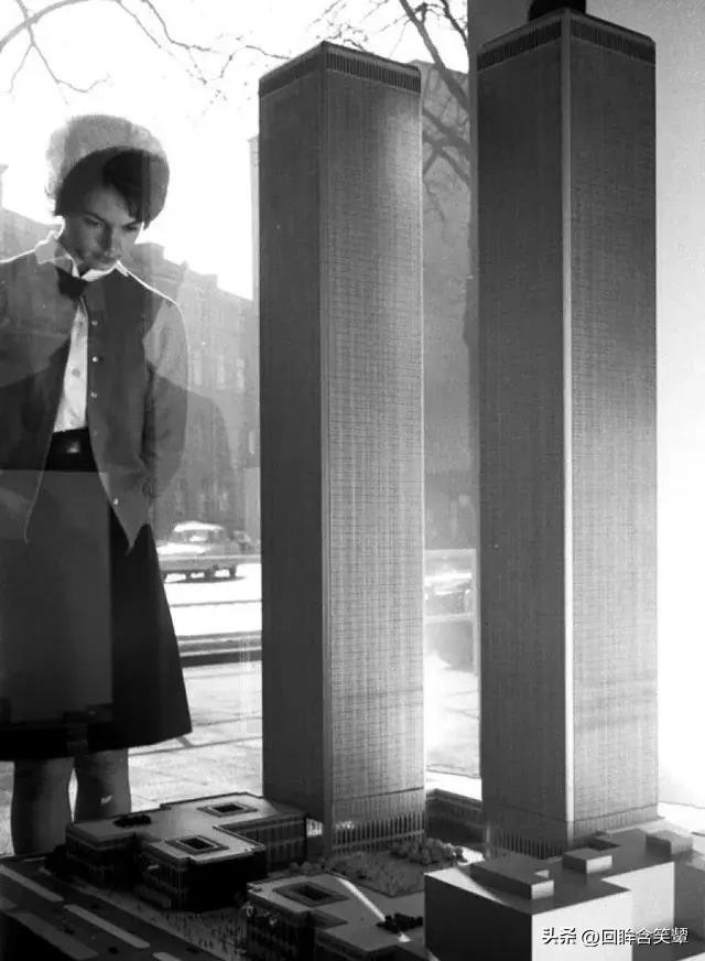 这是1960 年代后期,一位年轻的女生在即将建成的世贸大厦前观察。