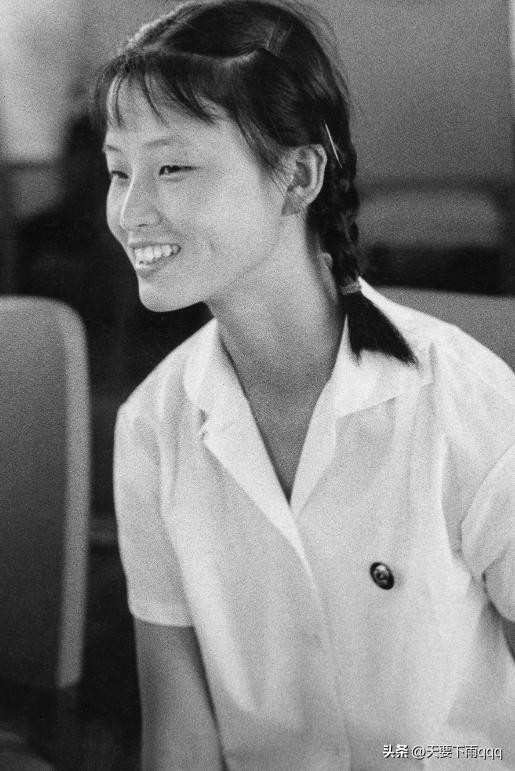 照片中的年轻女孩儿是一名上海芭蕾舞团的演员,可以看到在她的胸前佩戴着一个像章,在面前的桌子上还放着一本红宝书。