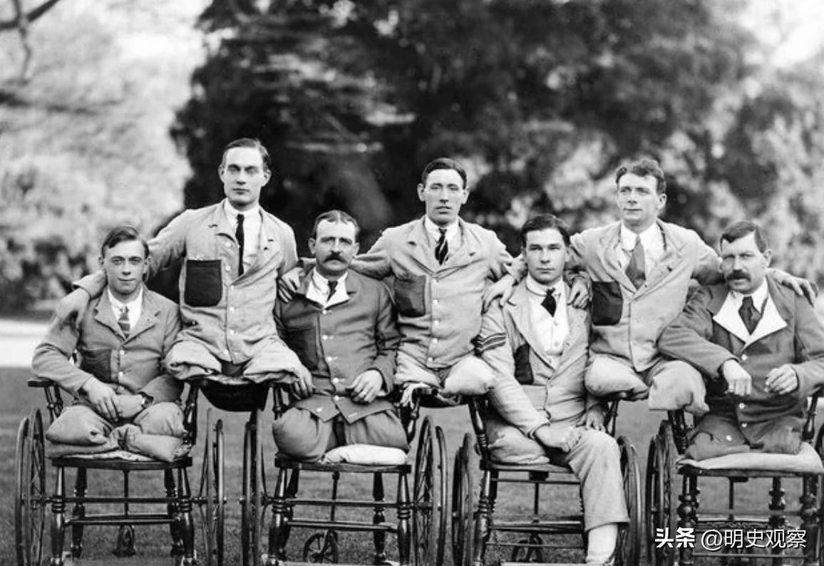 伦敦军事医院,1918 年。七名士兵的一条腿。