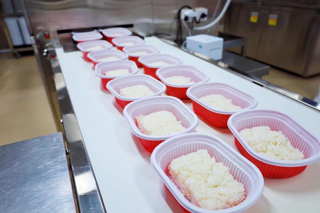 米饭全自动生产线上,从淘洗、煮饭到分装,均由机器完成。机器运行时,每隔一分钟就能煮出30多份米饭,两台分装机一小时可装饭5000多盒。