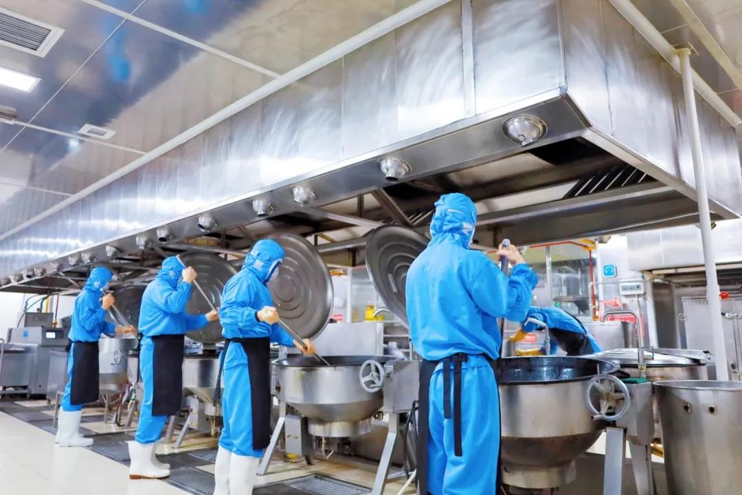 热气腾腾的烹饪间里,十几口大灶整齐排列,前端准备的物料在此集中。厨师团队分工合作、有序烹制。葱爆鸡丁、啤酒鸭、辣椒炒肉……随着各款菜品陆续出锅,诱人的香味扑鼻而来。