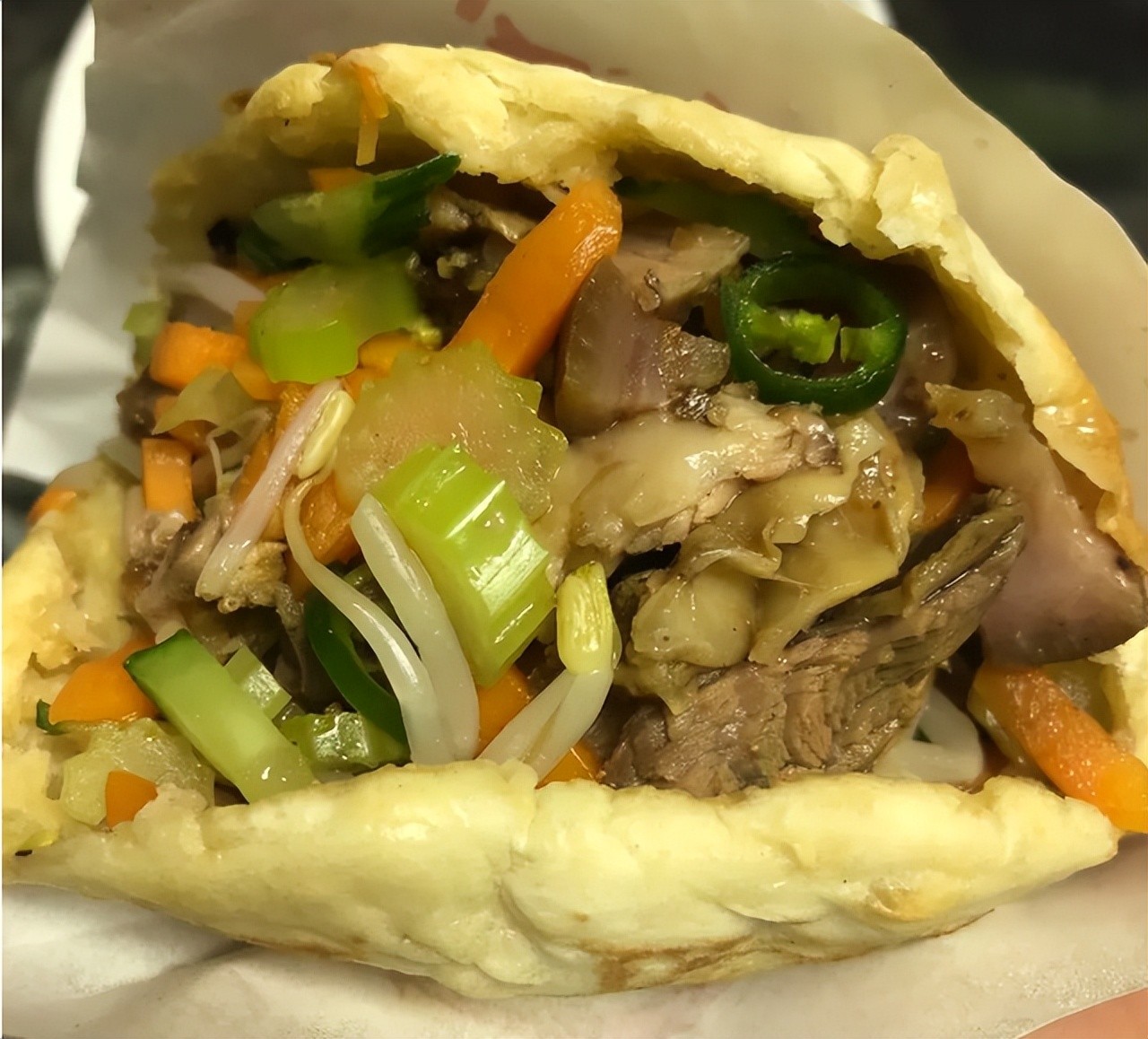 在郑州的街头,有很多卖白吉馍的小贩,白吉馍里边可以夹孜然羊肉,也可以夹腊汁肉,你既能吃到肉的软香,又能吃到饼皮的焦脆,肉中还带有浓郁的汤汁,越嚼越香。