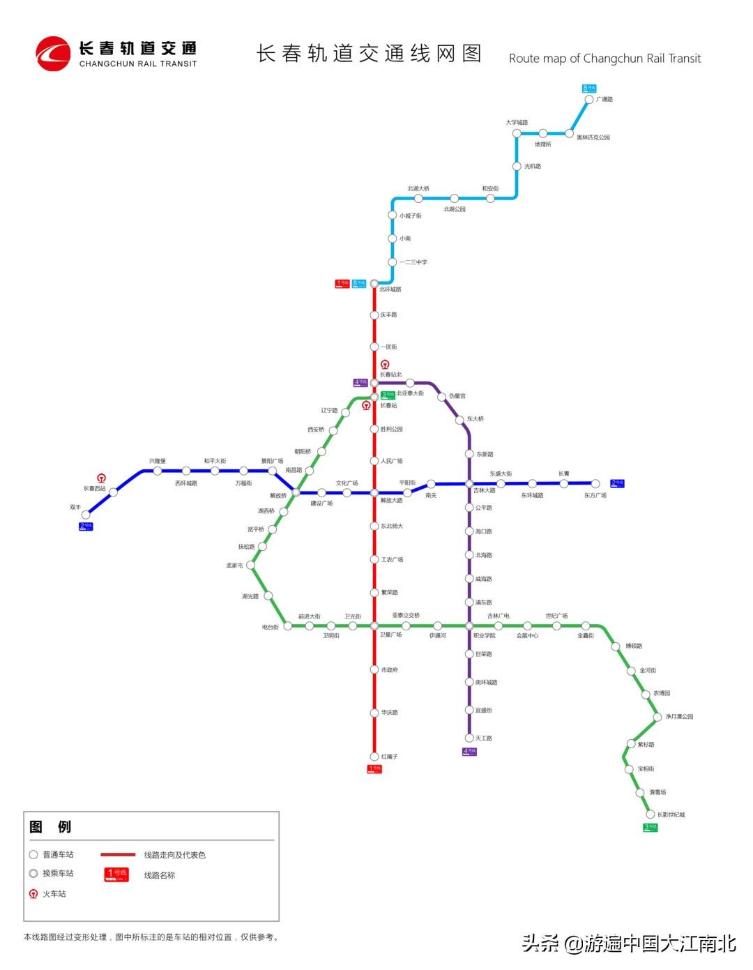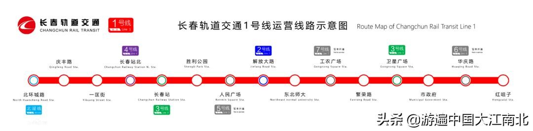长春轨道交通1号线,北起环城路站,止于红嘴子站,运营于长春市宽城区、朝阳区和南关区,途径人民广场、长春站、东北师范大学等地,呈南北走向[2]。