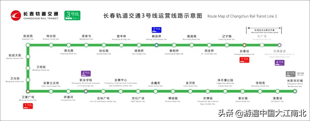 长春轨道交通3号线全长31.90公里,共设32座车站,其中1座地下车站,4座半地下车站,16座地面车站,11座高架车站,分别采用3节编组和6节编组两种编组类型的C型列车。