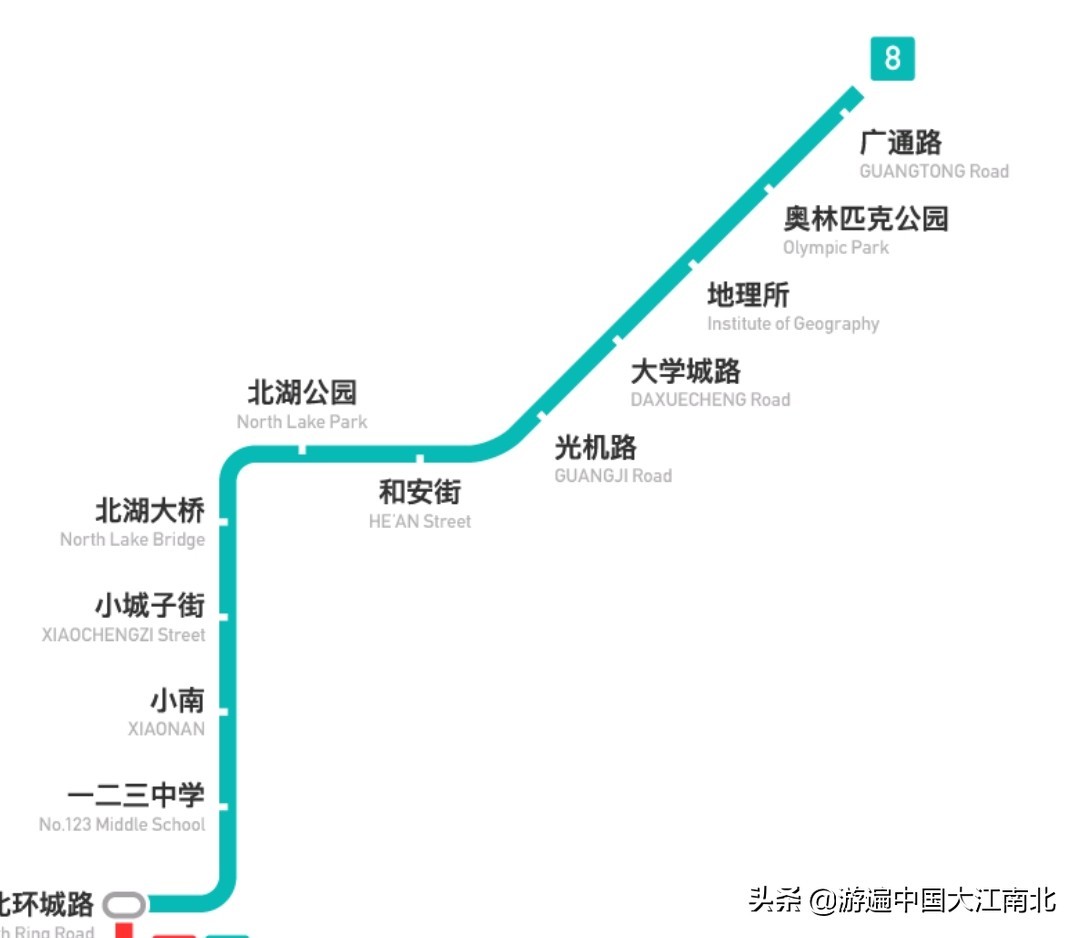 长春轨道交通8号线一期工程南起北环城路站,北至广通路站,运营于长春市宽城区、北湖开发区,途经砂之船(中东)奥特莱斯、北湖国家湿地公园、龙翔广场、中国科学院东北地理与农业生态研究所、奥林匹克公园,是线网中的中运量级辅助线,线路呈西南至东北走向。