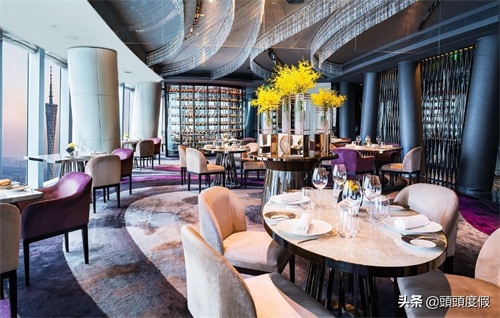 酒店共有4间餐厅,2个酒吧和1个咖啡厅,并提供24小时客房送餐服务,可以全方位满足旅客的不同餐饮需求。位于100层的佰鲜汇海鲜餐厅,是由国际著名室内设计师梁志天打造的举目繁星的用膳空间,让你体验云端的味蕾跳动。位于99层的天吧,伴着悠扬的音乐,欣赏着珠江美景,品尝着世界各地美酒,是何等幸事。位于71层的米其林一星中餐厅愉粤轩,让你品味到正宗的广州美食。