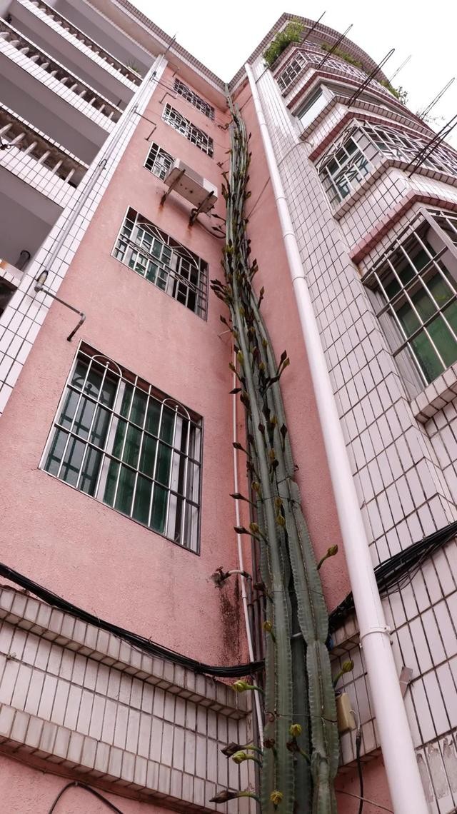 很多人对量天尺这个名字可能会很陌生,其实它是一款沙漠里的植物,是仙人掌科的植物,养护难度并不是很高。让刘先生万万没想到的是,他曾经一个小小的举动种下的这棵量天尺,竟然长了十几米高,在19年后引起了很多人的关注。这株量天尺不仅还活了十几年,而且已经长得高大无比,已经爬到了第6层,还开满了花,真是非常稀奇,也是小区中最美丽的风景线。