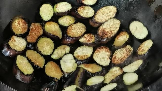 7.把茄饼煎至变软两面金黄,然后倒出备用。