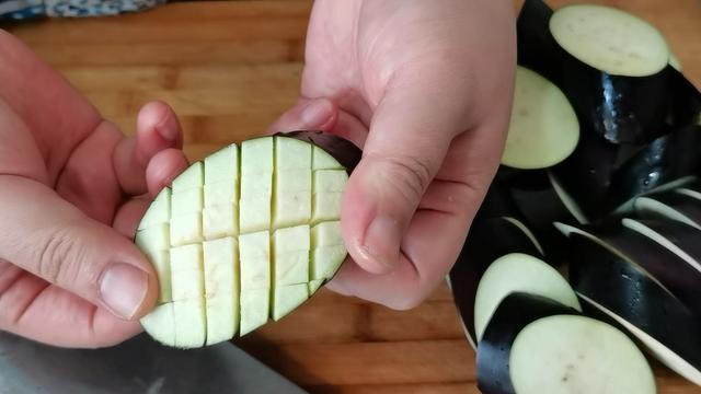 2.在茄饼的两面分别打上井字型花刀。