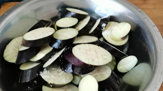 3.把所有的茄饼改刀完后,放入一个大盆中,加入少许的盐,轻轻的颠动盆让每一个茄饼都沾上少许的盐分。
