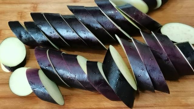 1.准备两根长茄子,把它切成大约有一厘米厚的茄饼。