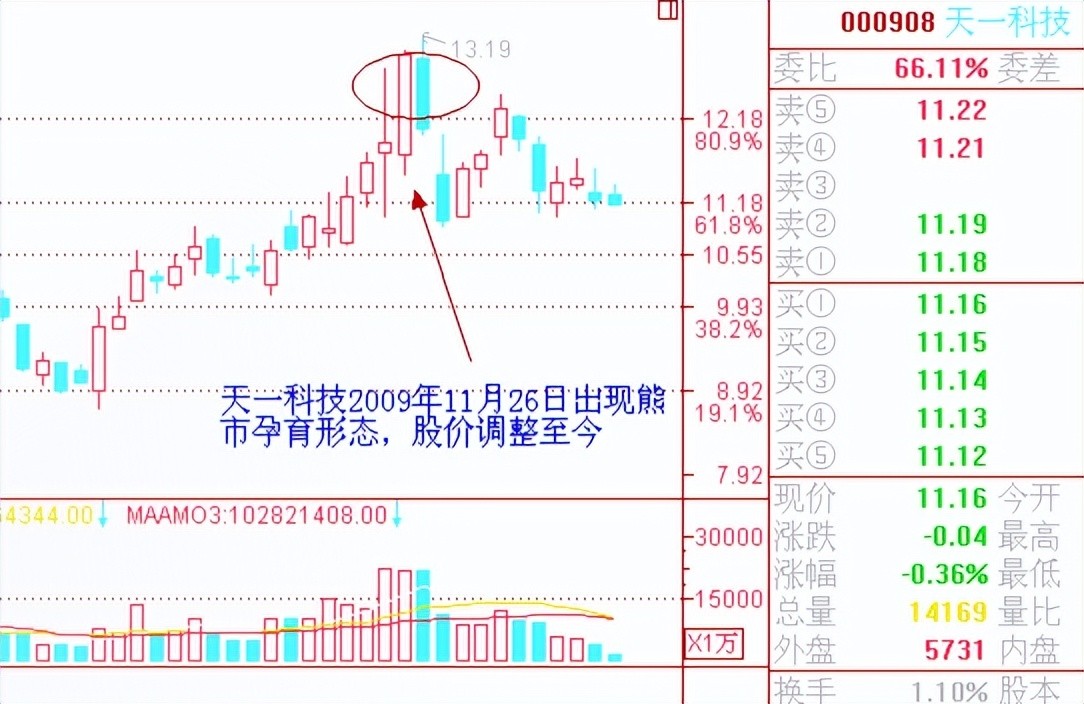 2.身怀六甲形态最理想的量能变化是,前一个交易日成交量有效放大,后一个交易日成交量又迅速萎缩,并且如果行情继续调整,则量能也会随之减少,这表示后市行情出现反转的可能性较大。