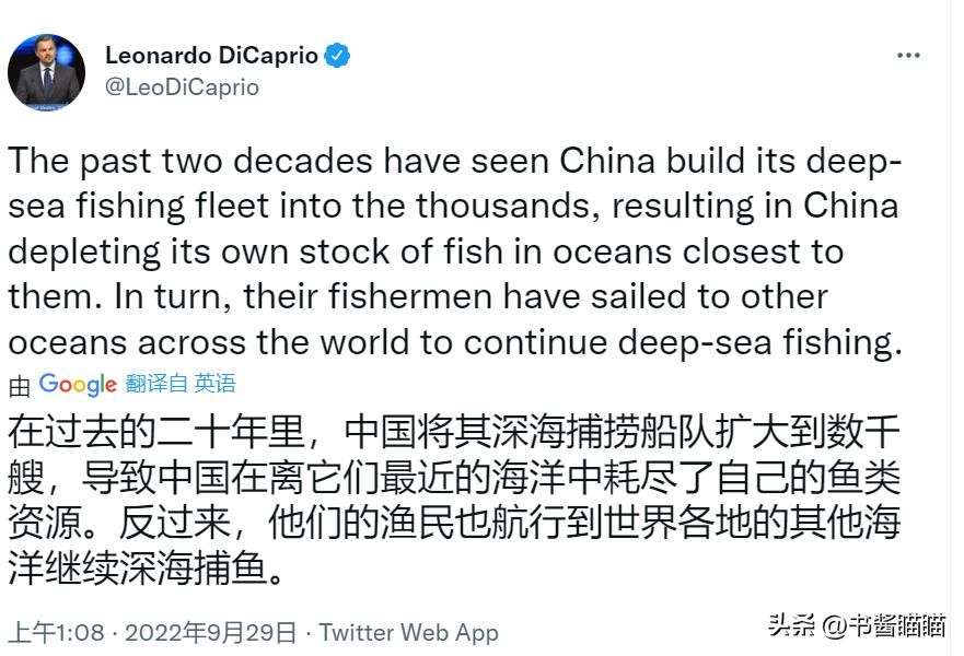 最近,在他个人的官方推特账号里,他就指责了中国的远洋渔船赴深海捕鱼影响到了海洋生物的发展!