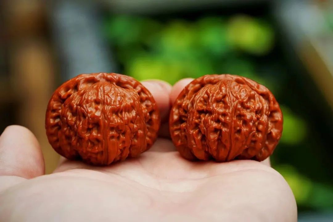 核桃在把玩过程中更应该加强养护,核桃的揉搓讲究先上手揉搓,后入布袋,再用手盘玩足够时间后,再用刷子干刷,再放入布袋,每日如此,反复操作,才能使核桃颜色趋于统一,美观自然,颜色亮丽,红润细美。