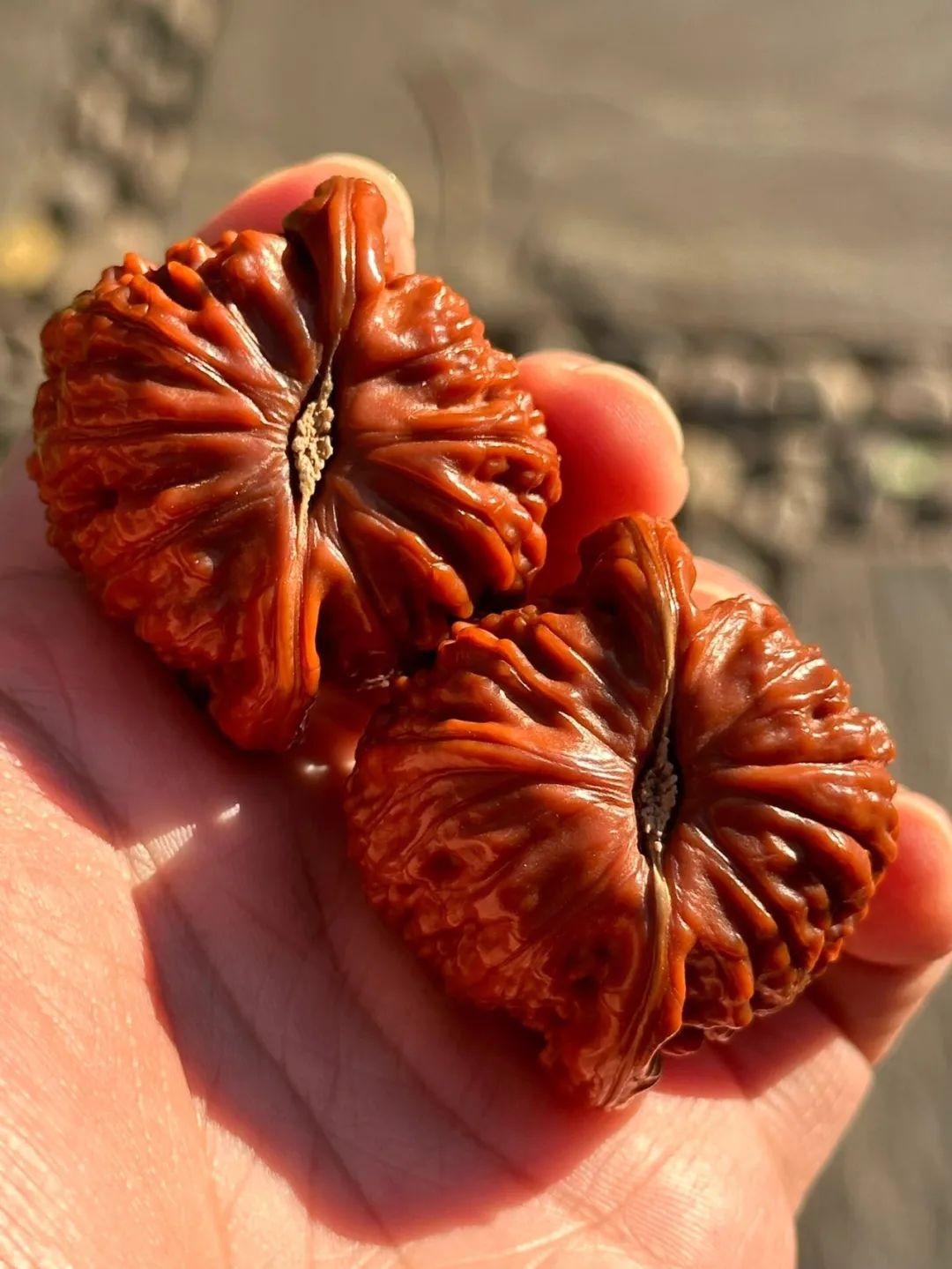门头沟闷尖狮子头原树在门头沟山区,树主人为了保护此树被嫁接,将原树码子全部毁掉,故市场上见不到原树产物。嫁接品种也一直未能面市。但此品种核桃个性十足,矮桩,大肚,小十字尖,小脐,纹路细腻且舒展,皮质坚硬密度极大,上手易红。也深受玩家们的追捧。