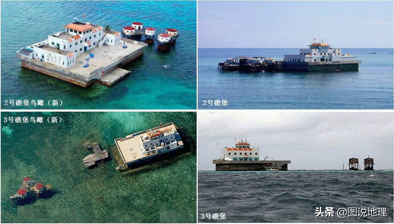 美济礁老礁堡,混凝土属于三代礁堡、旁边是早期建设的高脚屋