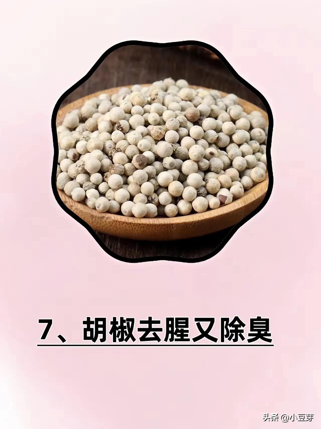 • 白胡椒:味道辛香,性辛温,温中散寒,适合海鲜、白肉料理,有去腥增香效果。
