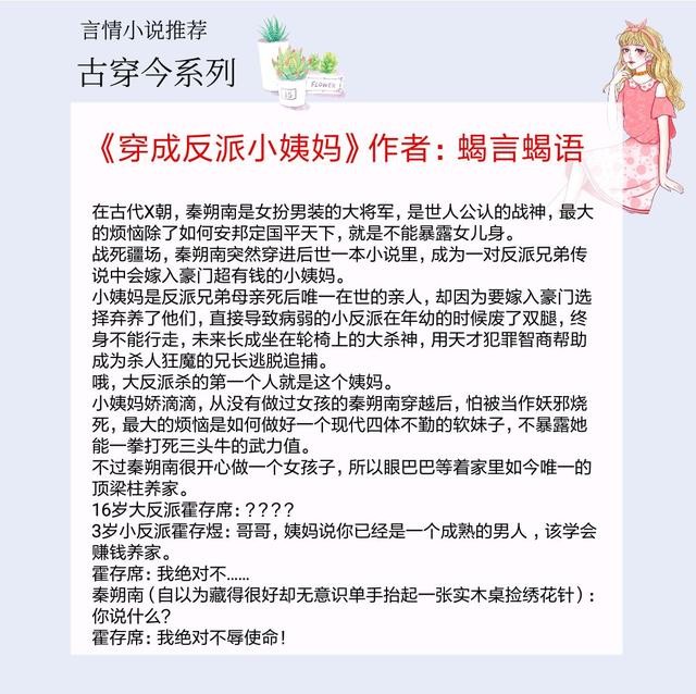 书评:在古代秦朔南是女扮男装的大将军,最大的烦恼除了如何安邦定国平天下,就是不能暴露女儿身。战死疆场,秦朔南穿进现代一本小说里,成为一对报社的的反派兄弟自私虚荣的小姨妈,最大的烦恼不是如何教养好大小反派,督促叛逆的大反派努力赚钱养家,而是如何做好四体不勤的现代女生,不暴露她一拳打死三头牛的武力值。