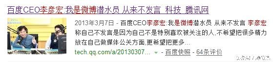 据悉李彦宏在新浪微博是潜水员,而马化腾只玩自己的腾讯微博。