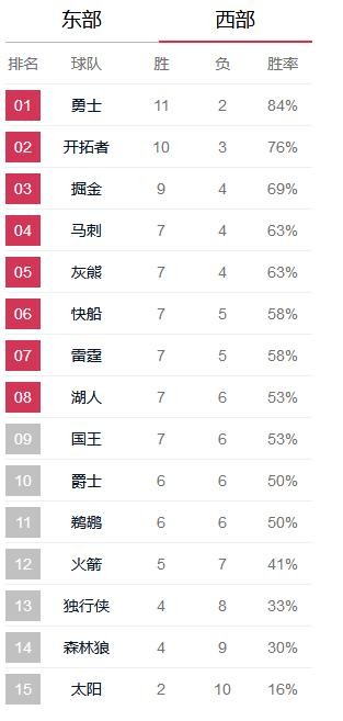 截止目前NBA西部球队排名