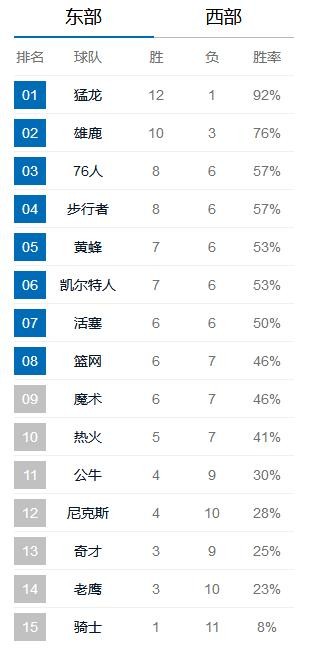 截止目前NBA东部部球队排名