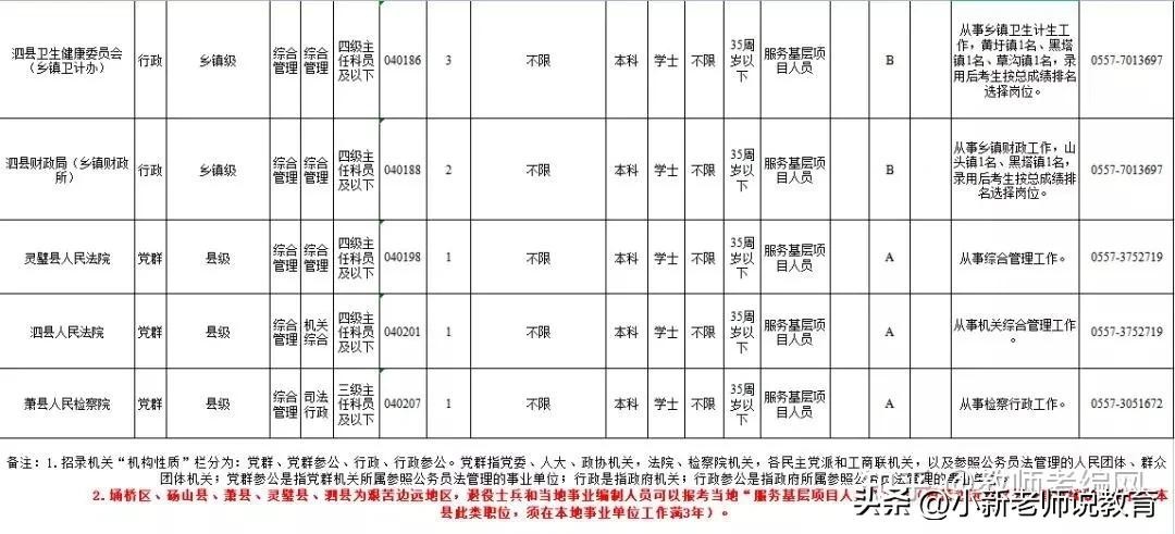 而且小编特别要更大家普及一个知识点,退役士兵和艰苦边远地区县乡事业编制人员可以报考艰苦边远地区县乡机关面向“服务基层项目人员”职位。以安徽宿州为例,可以通过职位表部分截图可以看到在偏远地区县乡有服务基层项目人员。