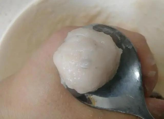 第三步:鱼肉泥可以用手再搅打摔打一下,使肉泥上劲,用压丸子神器压出鱼丸,然后用勺子接住放到凉水里。