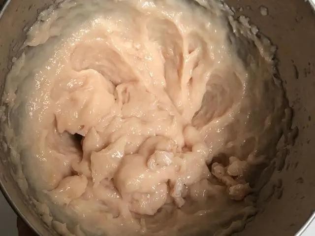 第二步:打好的鱼肉泥加加入2个蛋清,2大勺淀粉、2小勺食盐、两勺料酒,然后加入一半的葱姜水将其搅打均匀,然后加入剩下的葱姜水再次搅打均匀,搅打好的肉泥倒到大碗里。