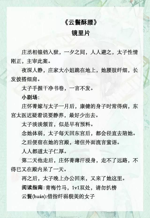 书评:整篇小说才100多章,男主太子腹黑狠厉,却对女主宠宠宠,但是作者设置了悬念,到后期女主才知道。各种细节的处理,都搭建的太好了,这篇小说一字不污,但是却字字带动读者的想象~