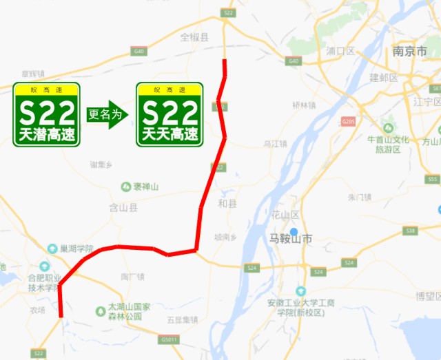 二、S22天潜高速更名为S22天(长)天(柱山)高速,马鞍山境内与G4221沪武高速共线。