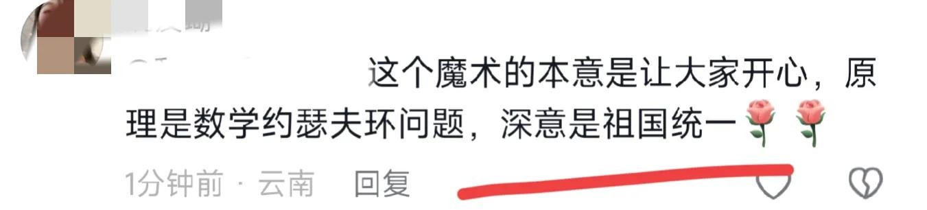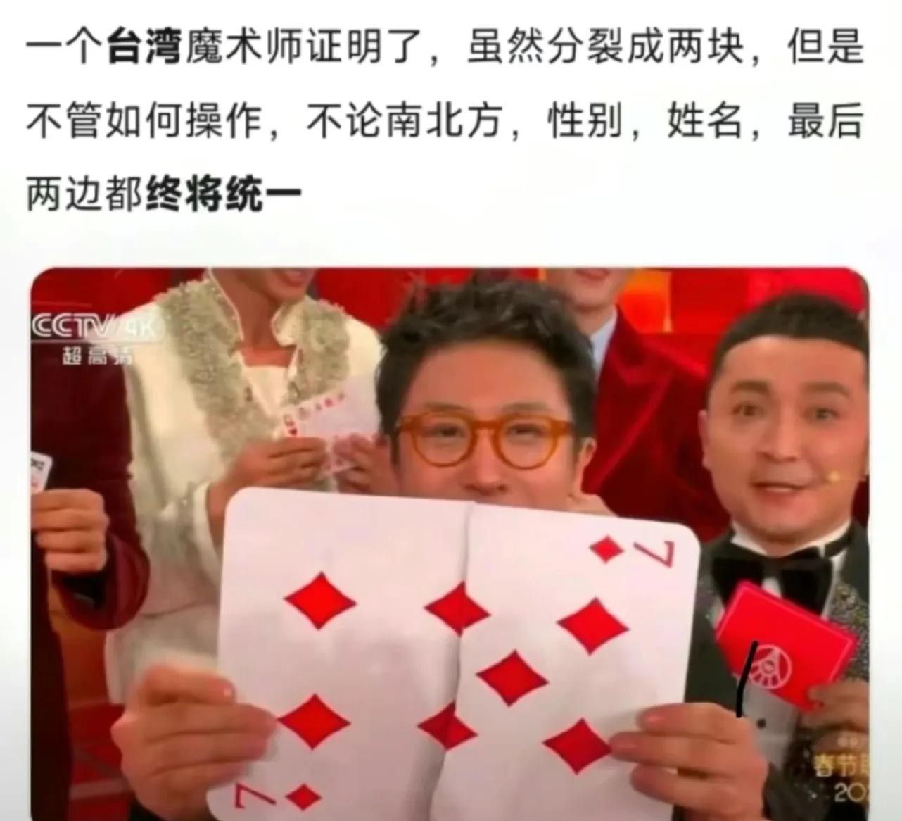 中国台湾的魔术师来给咱们表演了一出“祖国统一”寓意的魔术,哈哈哈用意匪浅啊!