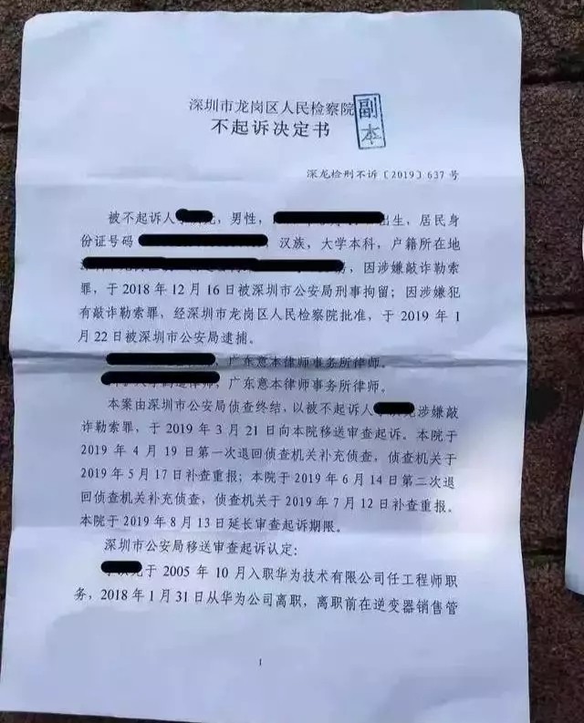 从龙岗区检察院的不起诉决定书内容来看,L姓员工并非涉嫌向H公司敲诈勒索,而是向其部门主管。这可以和第4点结合起来看。