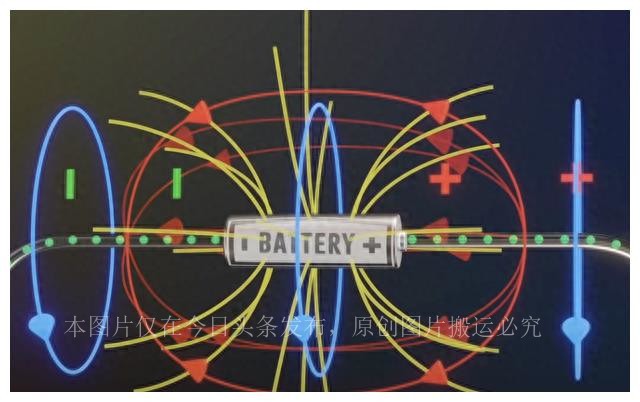 而电磁波,也就是同相振荡且互相垂直的电场与磁场。电磁场的传播方向是这样定义的:也就是说,根据右手螺旋定则,右手四指指向电场方向,然后往磁场方向握拳,大拇指的方向就是电磁场能量的传播方向。这也就是所谓的坡印廷矢量的方向。而电路中的能量也就是电能正是通过电磁场进行传递,并非通过电流。那我们计算电池的坡度矢量方向,就可以得出下面这样一张图。它的电磁波往四周散发,也就是把能量以自己为中心发送到场中。