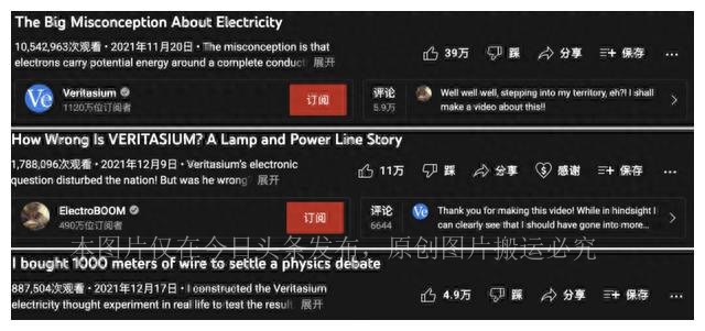 甚至还说:教科书里的相关说法都是错的。是不是有些不理解了?这不,这个答案加上题目“有关电学的一个巨大误解”,那可真是一石激起千层浪,不仅另一位电子工程师大佬——伊朗唐马儒ElectroBOOM下场一通狂锤:这是在关公面前耍大刀啊。李永乐老师也连出两个视频探讨这一问题。甚至还有Youtube博主真的买了1000米电线做实验……大佬们究竟产生了怎样的分歧?又是如何联手贡献了一场物理科普盛宴,让全球数百万网友嗨到飞起?