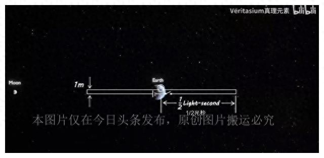 假设存在一个巨型电路,其中一个电源、一个开关、一个理想灯泡,通过2根30万公里长的导线连接,灯泡和开关之间仅相隔1m的距离,就像这样: