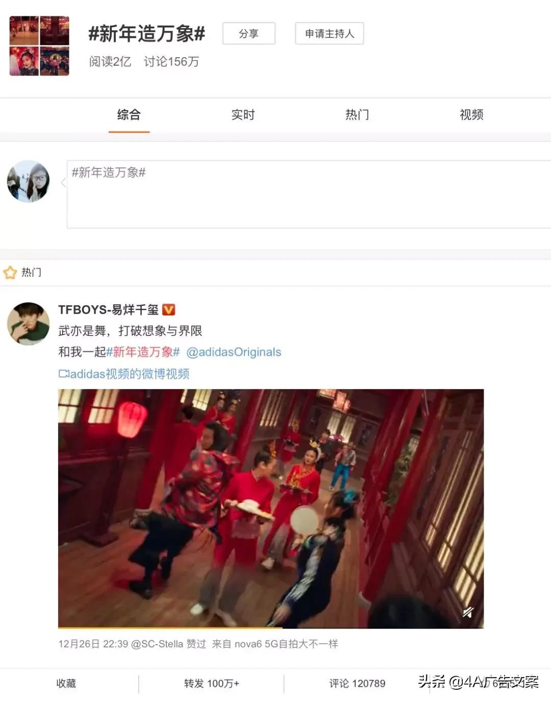 微博上,群星陆续发声,与阿迪达斯一起“新年造万象”,话题热度急速飙升,除了明星本身庞大的微博转发量,相关话题还创造了150万的讨论,2亿次阅读量。