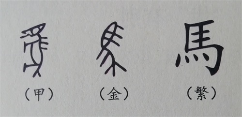 看上图,从甲骨文到金文到繁体的楷体,马 字的变化