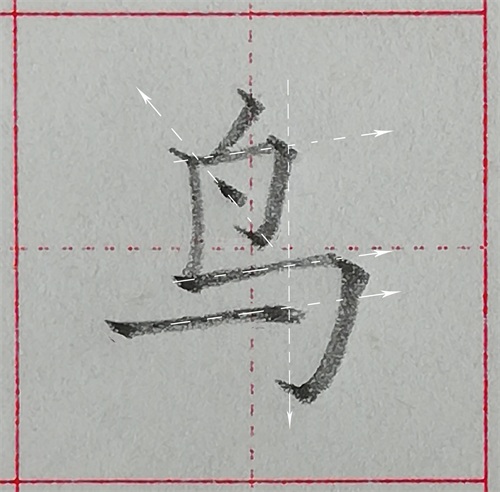 最后横笔从左半格中间向右写长横,方向和上方横笔一致,横笔末端和上方折笔和下方钩三者上下对齐。