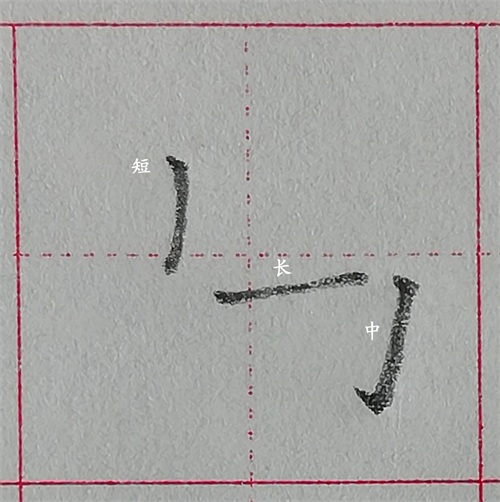 三部分的长短不同,上面最短,中间横笔最长,下方竖钩略短。