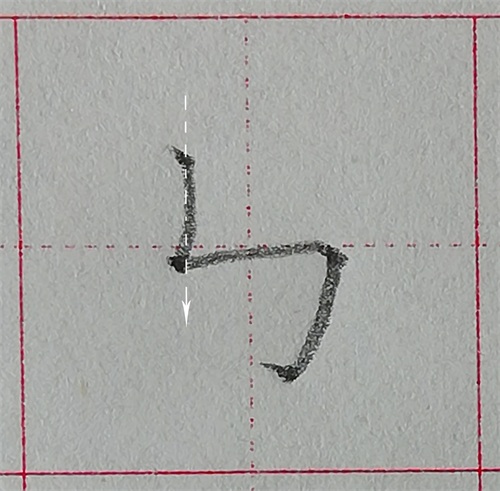 当折笔写到下半格中间时出钩,钩尖和上方第一笔横折的折笔处上下对齐,如下图所示