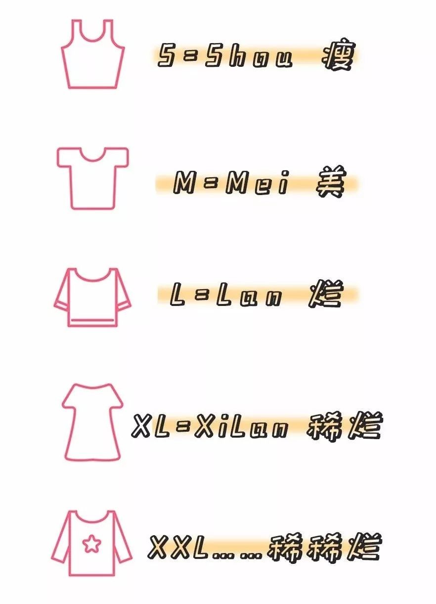 可能看完这张表,你会自我安慰,自己的身材好像也不是这么差劲!往下滑看看新的体型一览表,沉重暴击!体重划分这么严格。L码的女孩太难了