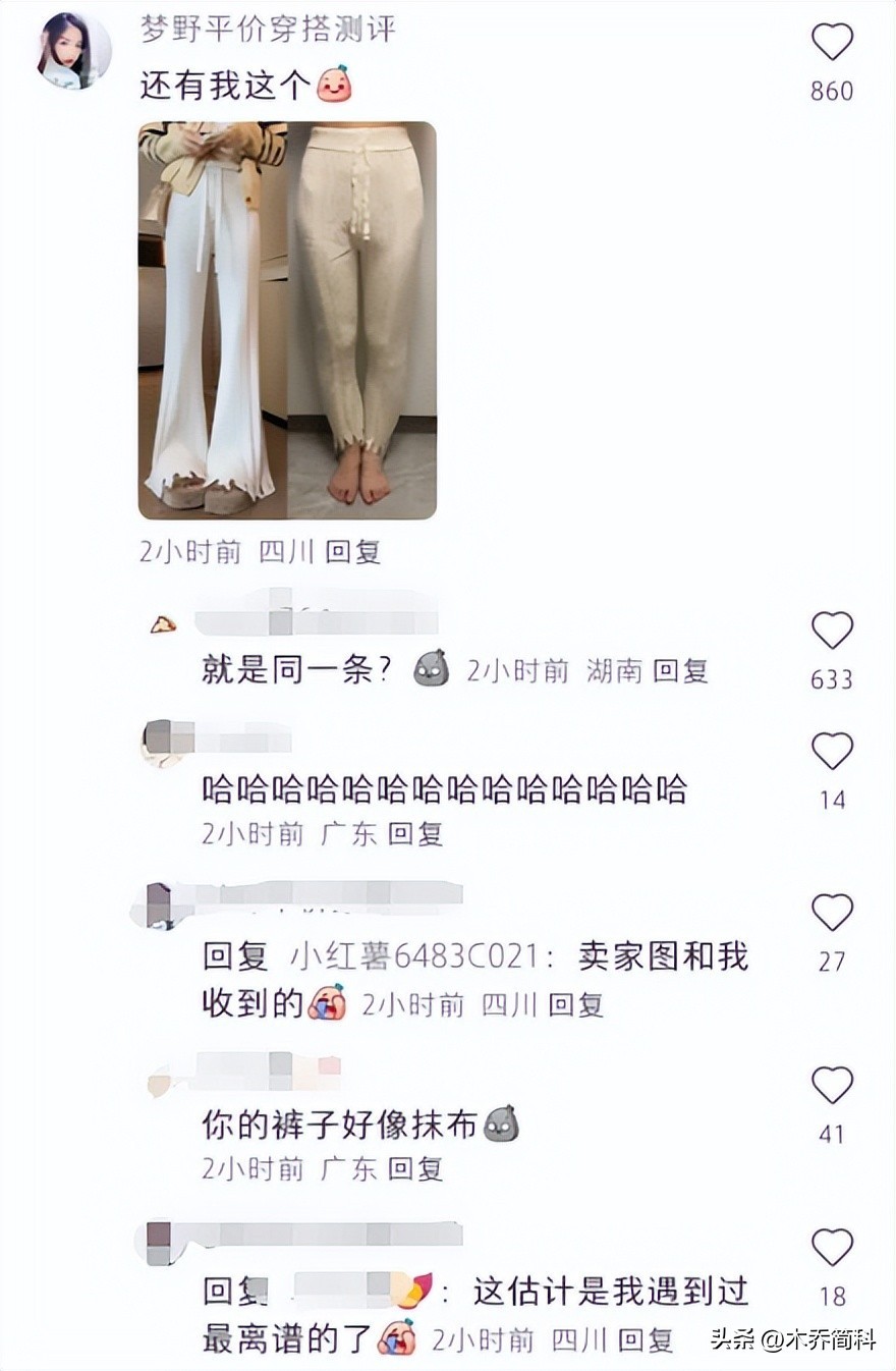 买的裤子质地像抹布就算了,穿上后更是一言难尽,最让买家伤心的是,竟然还有网友说,这是她遇到过的最离谱的对比图了。