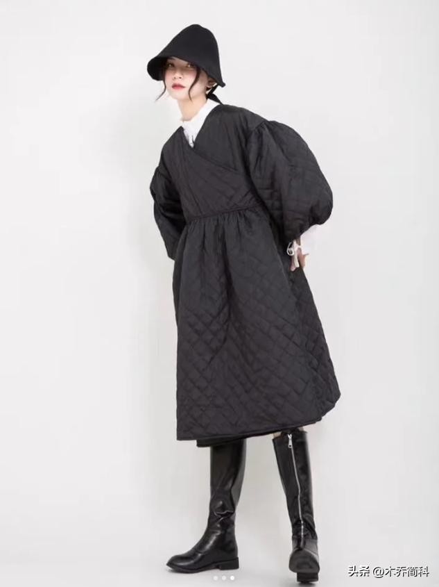下面这件黑色棉服,款式是不是很别致?模特穿上洋气又可爱,再配上一双黑色长靴,确实很时尚。