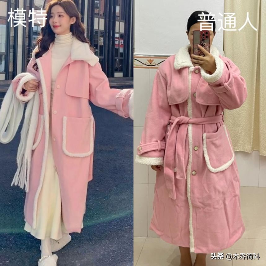 还有这件粉色毛呢大衣,模特穿上后又甜又粉嫩,衣服看着也很高档。可买家穿上……咱先不说码对不对,就想问问卖家:这衣服出货前就不能熨一下吗?或许还不会显得那么low。