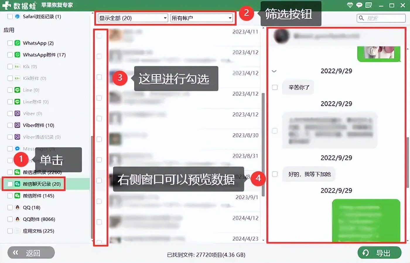 步骤3:通过【筛选】按钮,快速找到并预览聊天记录。勾选数据后,点击【导出】按钮。