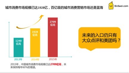 在这个百亿级的市场里,在城市消费和传统企业移动营销仪式觉醒的双重带动下,一定很快会迎来爆发式增长。美团和大众点评可以说是目前城市消费市场中的高阶选手,就在2015年,美团完成了100亿的市场份额,大众点评也完成了75亿的惊人成绩。可见城市消费的移动营销市场仍然存在着巨大的可挖掘的价值,消费者需要更多、更自由地选择空间,可以说这是一篇拥有无限可能的蓝海,下一个独角兽或许就会从中产生。
