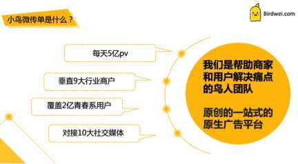 小鸟微传单是小鸟推送旗下的针对城市消费的新产品。2013年小鸟推送就完成了自主DSP平台的研发,目前已对接TANX、ADX、Doublie Click等竞价流量交换市场,聚合了100万个网站,18万个APP的推广渠道。在2015年小鸟推送专业版平台为几十个游戏、金融、社交APP提供了营销服务,2015年后半年,开始对接各入口级APP的流量资源,并且主攻原生广告资源,将广告转化为小段子发到用户的社交媒体里面,效果比banner提升80%。