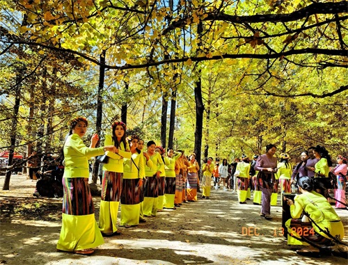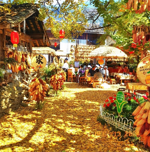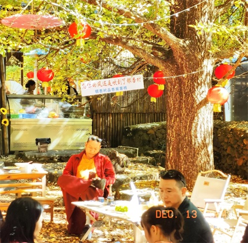 我们走到广场中部北边的一个农家土菜馆,坐在院里小桌上先解决了午餐问题,然后走进银杏林,恰遇一队身穿傣族服装的女人在拍视频,看了一会儿,由广场南侧一条银杏大道往东,挨家挨户观赏“林在村中、村在林中”的自然风光和银杏美景。