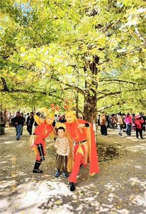 银杏广场,是银杏村的核心区域,拥有连片的银杏林1万余亩、3万余株。广场上人来人往,抖音直播、旅拍美拍、婚纱摄影、唱歌跳舞、游乐园艺,应有尽有。路边还有很多小吃摊和卖土特产的村民。